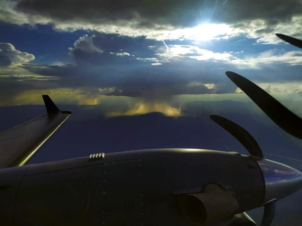 Por medio de tanques de acero inoxidable inyectamos nuestro reactivo RAINMATE® elaborado a base de yoduro de plata con presión a la atmósfera, y como es una solución volátil, en el momento que sale a la atmósfera se volatiliza el líquido que llevan a los núcleos dejándolos nítidos en la atmósfera.